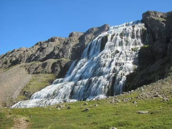The waterfall cascades almost 330 feet (about 100 meters) down a rugged hillside. It's about 100 feet (roughly 30 meters) wide at the top and 196 feet (around 60 meters) wide at the bottom. Dynjandi has a triangular appearance, which looks similar to a bridal veil.
