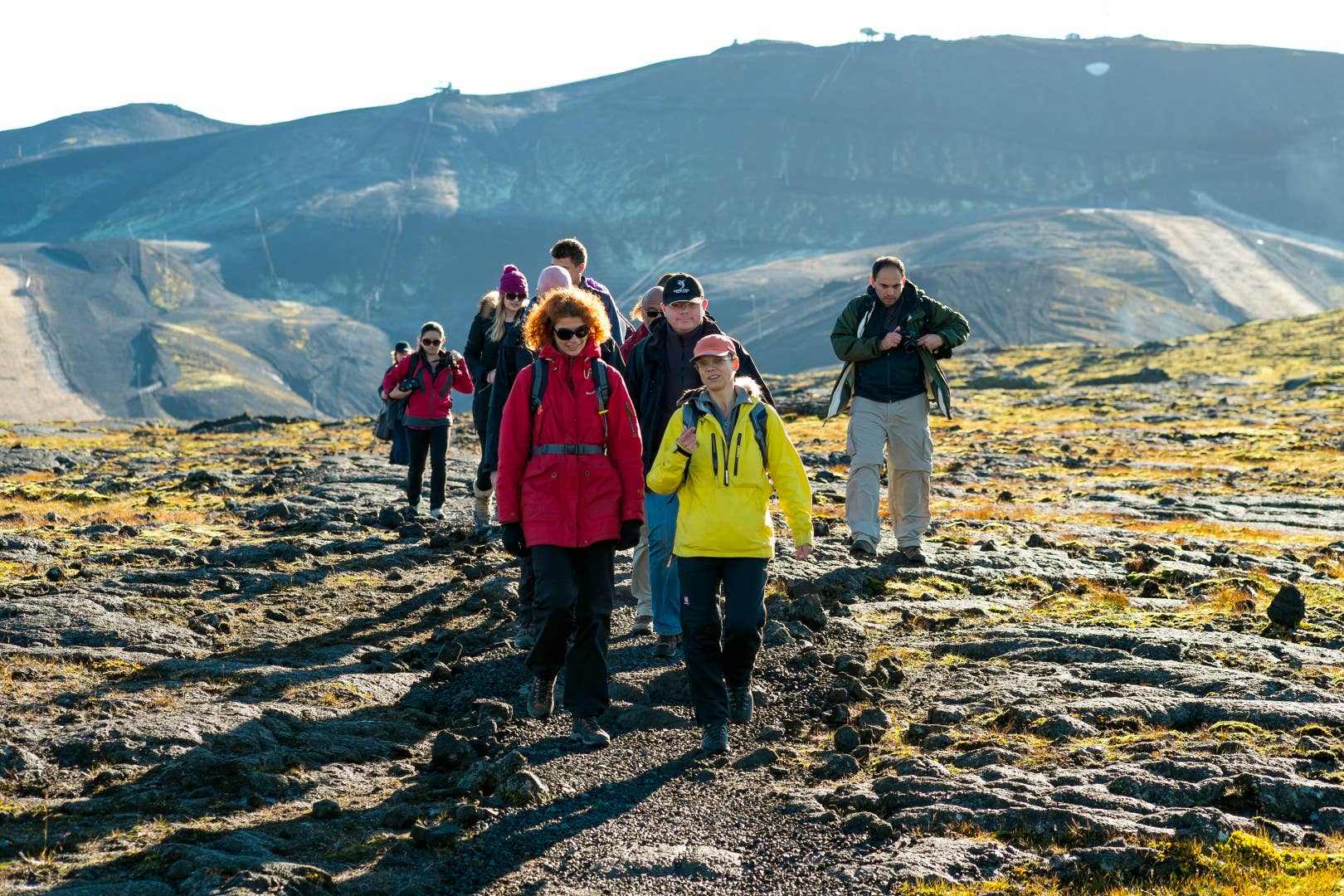 From here, you will head out to the lava fields and hike to the volcano entrance for about 2 miles (3.2 kilometers). Once you arrive at the Thrihnukagigur volcano, the magic happens, and you will descend into its vast interior in an impressive one-of-a-kind elevator.