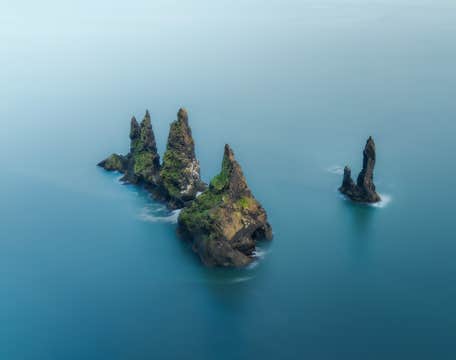 Kig ud over havet nær kysten for at nyde udsigten over de spektakulært formede havklippesøjler kaldet Reynisdrangar.