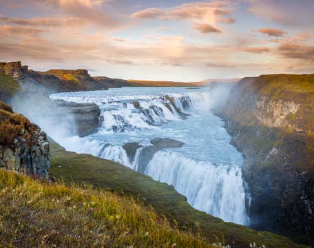Auf unserem Weg zurück nach Reykjavík machen wir einen finalen Stopp beim Wasserfall Gullfoss, der letzten atemberaubenden Sehenswürdigkeit des Goldenen Kreises Hier hast du die Möglichkeit, den massiven Wasserfall von einer Aussichtsplattform auf den Klippen über dem Fluss von oben zu betrachten und dabei die Wassermassen unaufhaltsam in die Tiefe stürzen zu sehen. Du wirst den feinen Sprühnebel auf deinem Gesicht spüren und das Abenteuer wortwörtlich hautnah erleben.