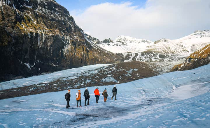 Kun varusteet ovat kunnossa, lähdet rauhalliselle noin 30 minuutin kävelylle jäätikköä kohti. Ohitat matkan varrella mustasta tuhkasta koostuvia vulkaanisia maisemia ja jäätikkölaguunin, ennen kuin saavut jäätikön reunalle.