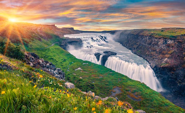 Depuis la petite Faxi, vous vous dirigerez vers la spectaculaire chute d'eau de Gullfoss. La rivière glaciaire Hvita plonge de manière spectaculaire sur 32 mètres dans un canyon, créant cette magnifique cascade, l’une des attractions les plus emblématiques d’Islande. Avec un peu de chance, vous pourrez même observer un arc-en-ciel qui s’étire du ciel jusqu’au fond du canyon, offrant l’occasion parfaite pour une photo.