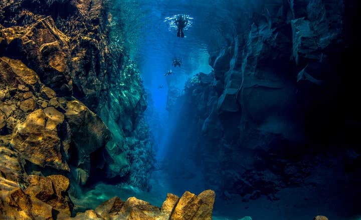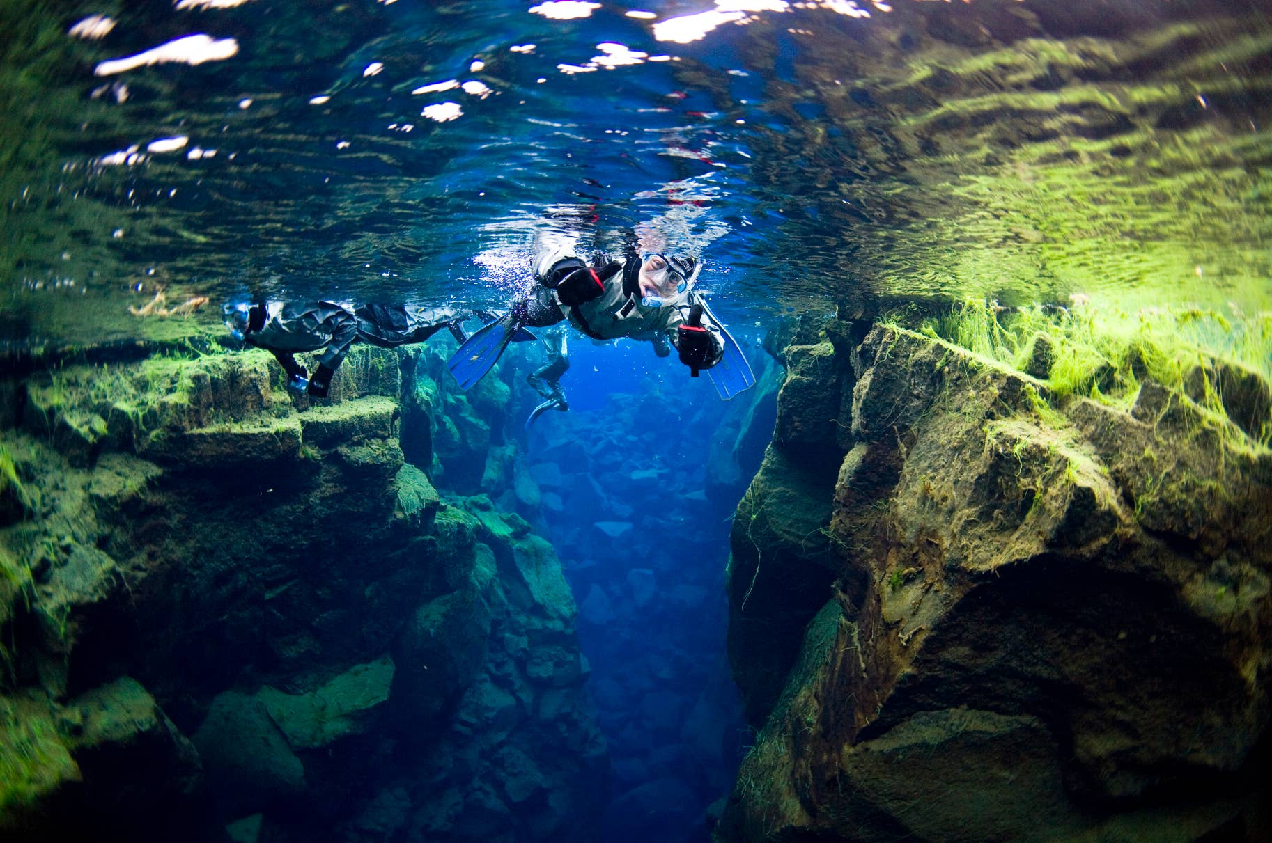 La faille de Silfra se trouve au cœur d’un immense champ de lave, dans des eaux d’un bleu profond, offrant jusqu’à 150 mètres de visibilité dans ce paradis sous-marin aux nuances surnaturelles. Située dans le Parc national de Thingvellir, classé au patrimoine mondial de l’UNESCO, cette fissure est aussi le lieu du tout premier parlement islandais, l’Alþingi, fondé en 930 après J.-C. Nos guides hautement qualifiés vous accompagneront dans cette aventure de plongée avec masque et tuba. Silfra est régulièrement classée parmi les dix meilleurs sites de plongée au monde, faisant de cette activité un passage obligé pour les voyageurs en Islande.