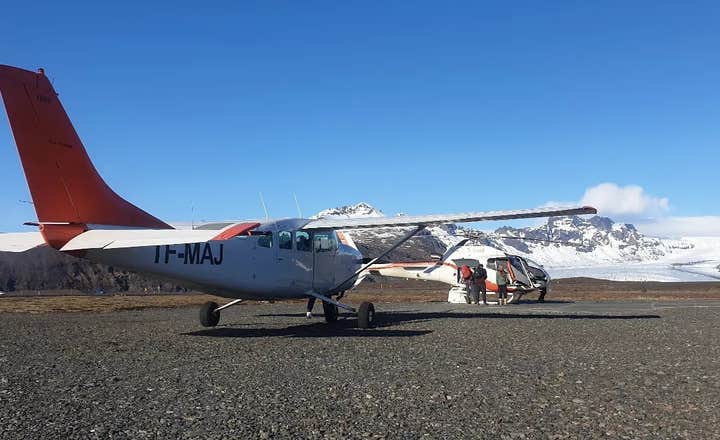 La sortie débute à l'aérodrome privé de Skaftafell, situé dans le sublime parc national de Vatnajökull. Vous montez à bord d'un petit avion et débutez votre vol au-dessus des langues glaciaires provenant du majestueux glacier Öræfajökull.