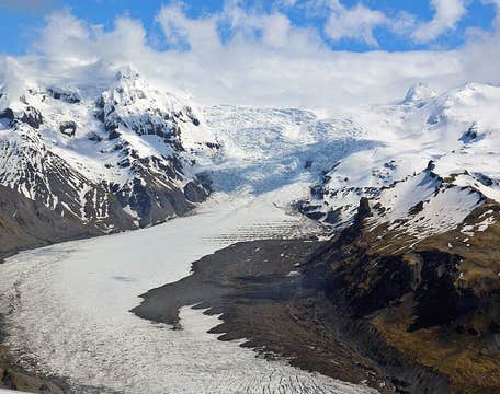 De là, vous survolez la zone colorée de Kjós, située à l'extrémité de Morsárdalur. Ici, vous profitez d'un point de vue exceptionnel sur le plus haut sommet d'Islande : Hvannadalshnjúkur (2109 m), qui fait partie du bord du cratère du glacier Öræfajökull. Le glacier Öræfajökull est aussi un volcan qui est entrée en éruption deux fois dans l'histoire, en 1362 et 1727. En fait, il s'agit du plus grand volcan actif du pays.