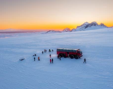 Al campo base di Geldingafell, è il momento di salire a bordo dell'enorme monster truck per il ghiacciaio. Questo veicolo specializzato è uno dei monster truck per ghiacciai più grandi al mondo, che consente di viaggiare comodamente anche su terreni accidentati, mentre si viene trasportati fino agli estremi confini dell'incredibile ghiacciaio.