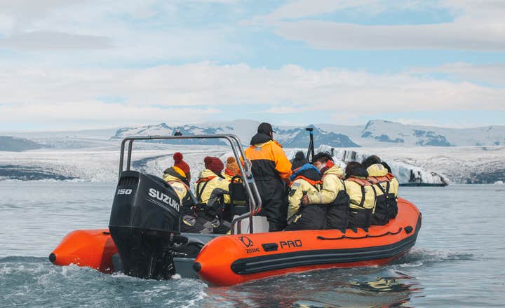 スピード感のあるインフレータブルボートに乗って幻想的な氷河湖を楽しんでみませんか?アイスランドで最も美しいと言われている絶景スポット、ヨークルスアゥルロゥン氷河湖でユニークな体験をお見逃しなく!