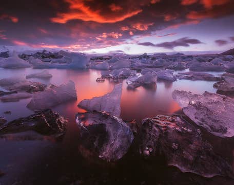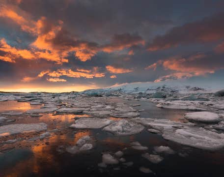 배에 오르기 전, 호숫가에서 바라보는 빙하호수의 경이로운 풍경이 감탄을 자아낼 거예요. 하지만 물 위에서 바라보는 호수는 또 다른 경험을 선사합니다. 크기와 모양이 각기 다른 빙산들이 파란색의 다양한 음영을 띠며 떠 있는 모습은 마치 다른 세상에 온 듯한 느낌마저 자아내지요. 이 석호는 바트나요쿨(Vatnajokull) 빙하에서 녹아내린 물이 모여 형성된 곳으로, 멀리서 빙하혀가 보이는 초현실적인 풍경을 선보입니다.