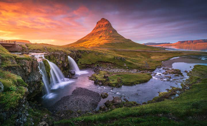 Det siste stoppet er ved det mest fotograferte fjellet på hele Island. Kirkjufell står for seg selv i et hav med grønne åser og villblomster, omgitt av sildrende elver og små fossefall. Dette er uten tvil et av de mest naturskjønne områdene i landet. Du bør absolutt ha kameraet lett tilgjengelig når du besøker denne attraksjonen.