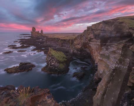 Den mest bemerkelsesverdige av disse geologiske formasjonene er de to basaltsøylene som kalles Lóndrangar, så høye og slående at mange har sammenlignet dem med et slott. I nærheten av disse kan du vandre langs en nydelig svart strand, Djúpalónssandur, der klippene er hjemstedet til mange hekkende sjøfugler. Deretter fortsetter du på dagsturen på Vest-Island.