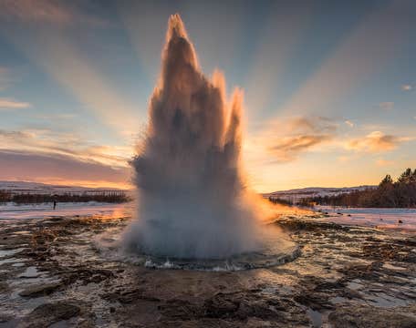Następnie odwiedzisz majestatyczny wodospad Gullfoss — „Złoty Wodospad”. Spadająca z hukiem woda, zasilana topniejącym lodowcem Vatnajokull, opada kaskadami w głęboki wąwóz. Spacerując wzdłuż krawędzi wodospadu, poczujesz jego moc — i delikatną mgiełkę wody na twarzy.