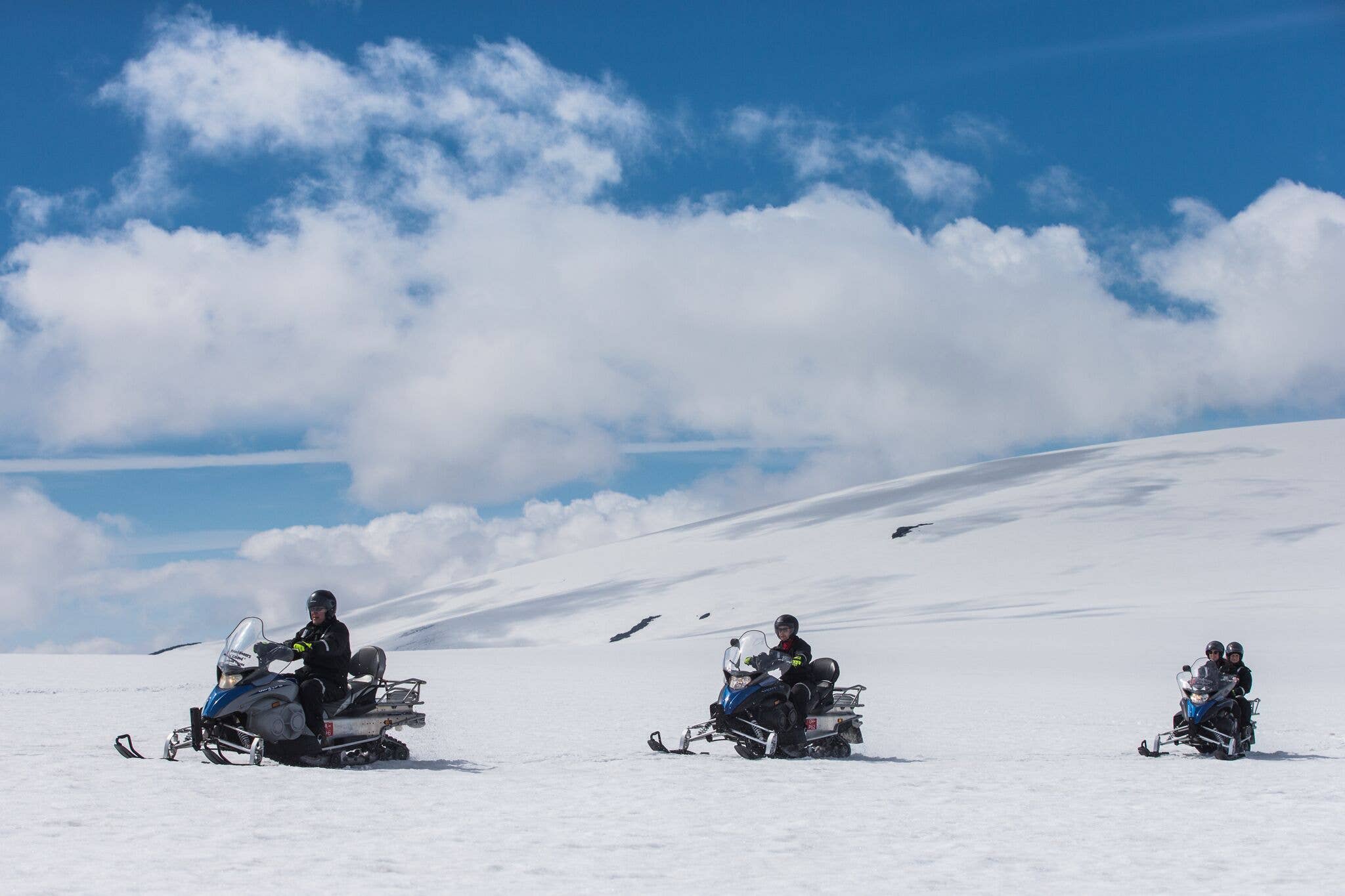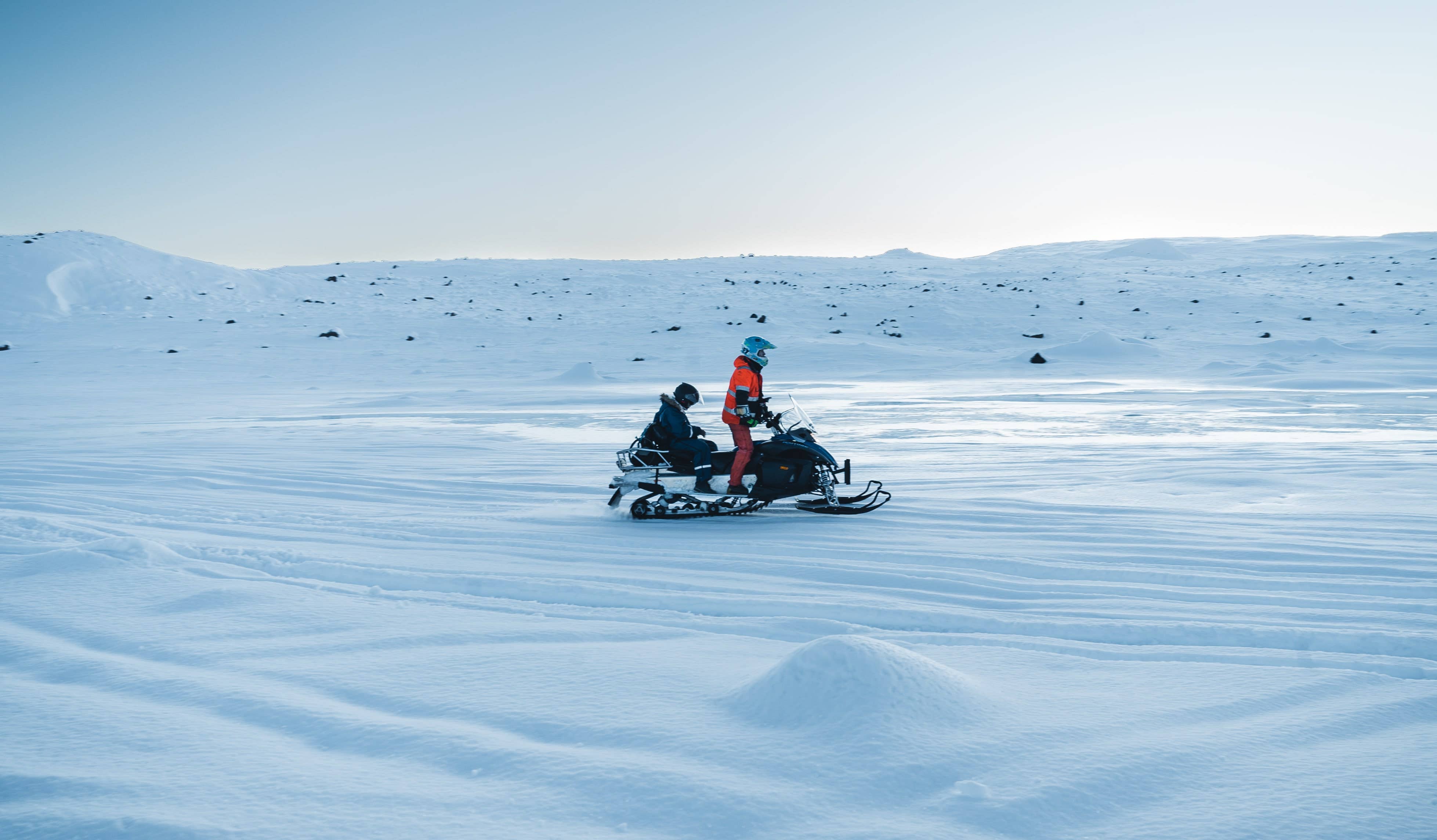 Na zakończenie dnia czeka Cię prawdziwy zastrzyk adrenaliny — wyprawa skuterem śnieżnym po lodowcu Langjokull, drugim co do wielkości lodowcu Islandii. Pokryte śniegiem szczyty, niekończąca się biel i zapierające dech w piersiach widoki sprawią, że poczujesz się jak na dachu świata.