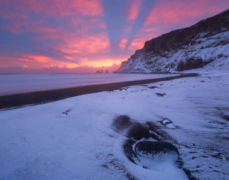 Po zakończeniu trekkingu ruszysz na dalsze zwiedzanie południowego wybrzeża, odwiedzając słynną czarną plażę Reynisfjara. Znana jest z olbrzymich bazaltowych kolumn, potężnych fal i formacji skalnych Reynisdrangar, które według legendy są skamieniałymi trollami. To także jedno z najczęściej fotografowanych miejsc na Islandii.