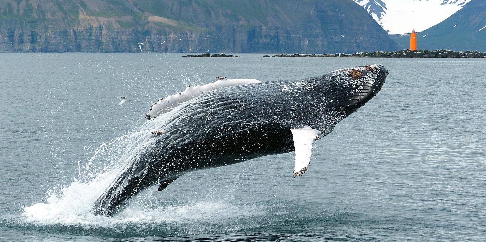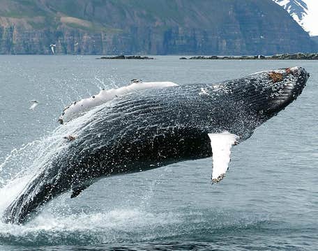 Сначала вы отправитесь на морскую прогулку по спокойным водам Эйя-фьорда, чтобы понаблюдать за китами. По мере того как судно будет двигаться по фьорду, с обеих сторон откроются виды на горы, а с открытой палубы можно будет любоваться морскими просторами.