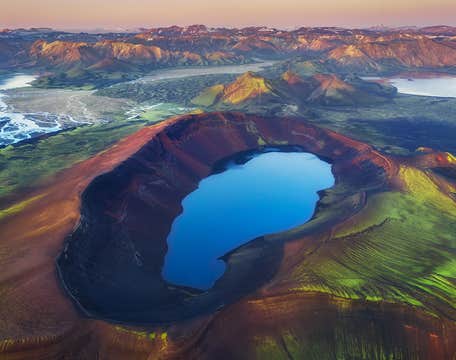 Риолитовые горы Ландманналёйгар поразят вас всеми оттенками розового, зеленого, и золотисто-желтого цветов, придающими всему району совершенно неземной вид. У вас будет возможность отправиться в пеший поход по одному из маршрутов высокогорья, прежде чем вы расслабитесь в геотермальных водах горячего источника после долгого и насыщенного дня.