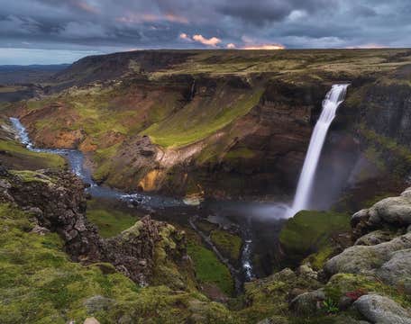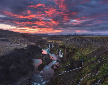 Первой остановкой на вашем пути будет долина Тьйоурсаурдалюр, где вы посетите водопад Хьяульпарфосс. Он расположился посреди лавового поля стратовулкана Хекла, и представляет собой чудесный двойной каскад, срывающийся с обрыва из реки Фоссау.