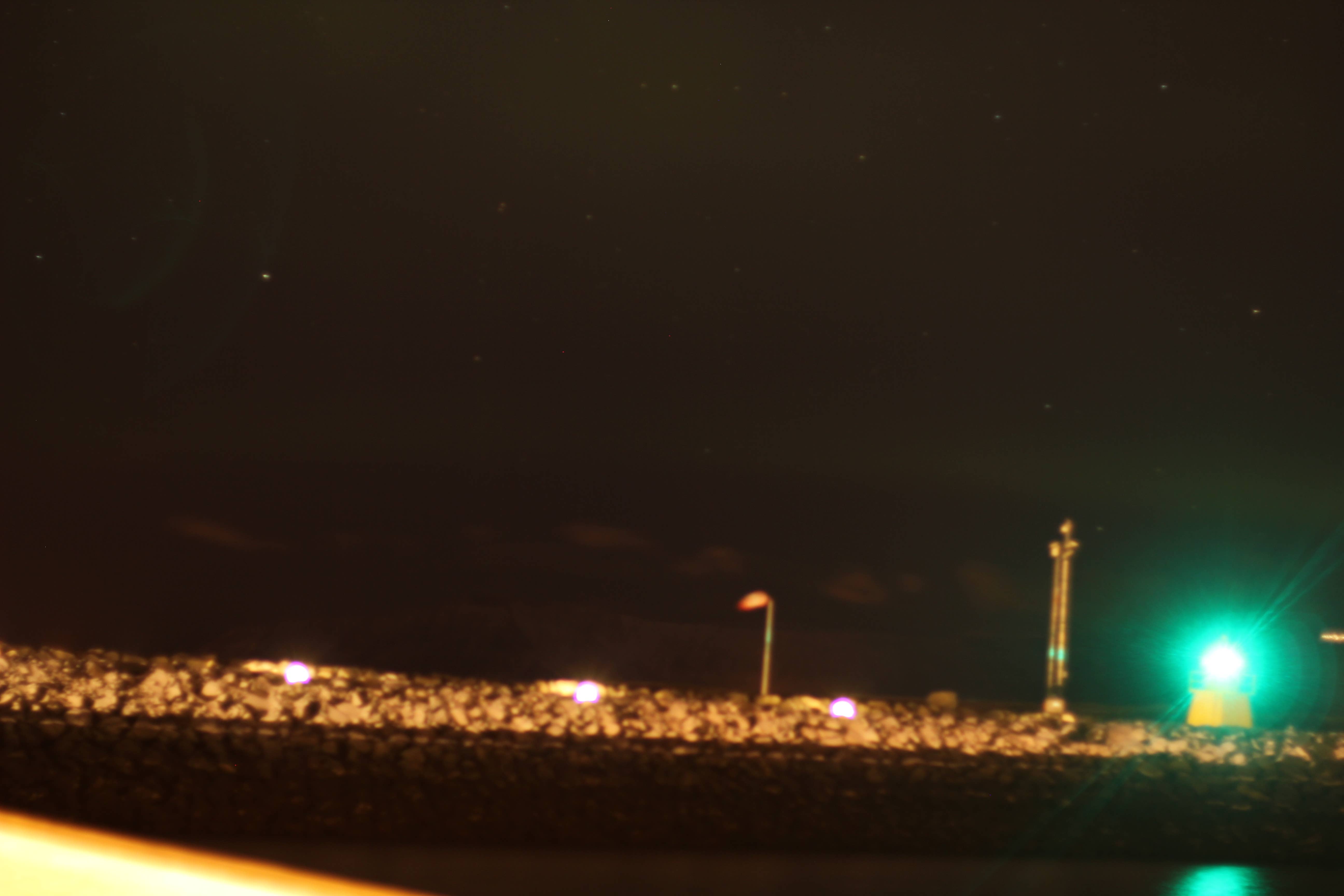 The light on the lower right is a boat, the stuff on the upper left is its reflection